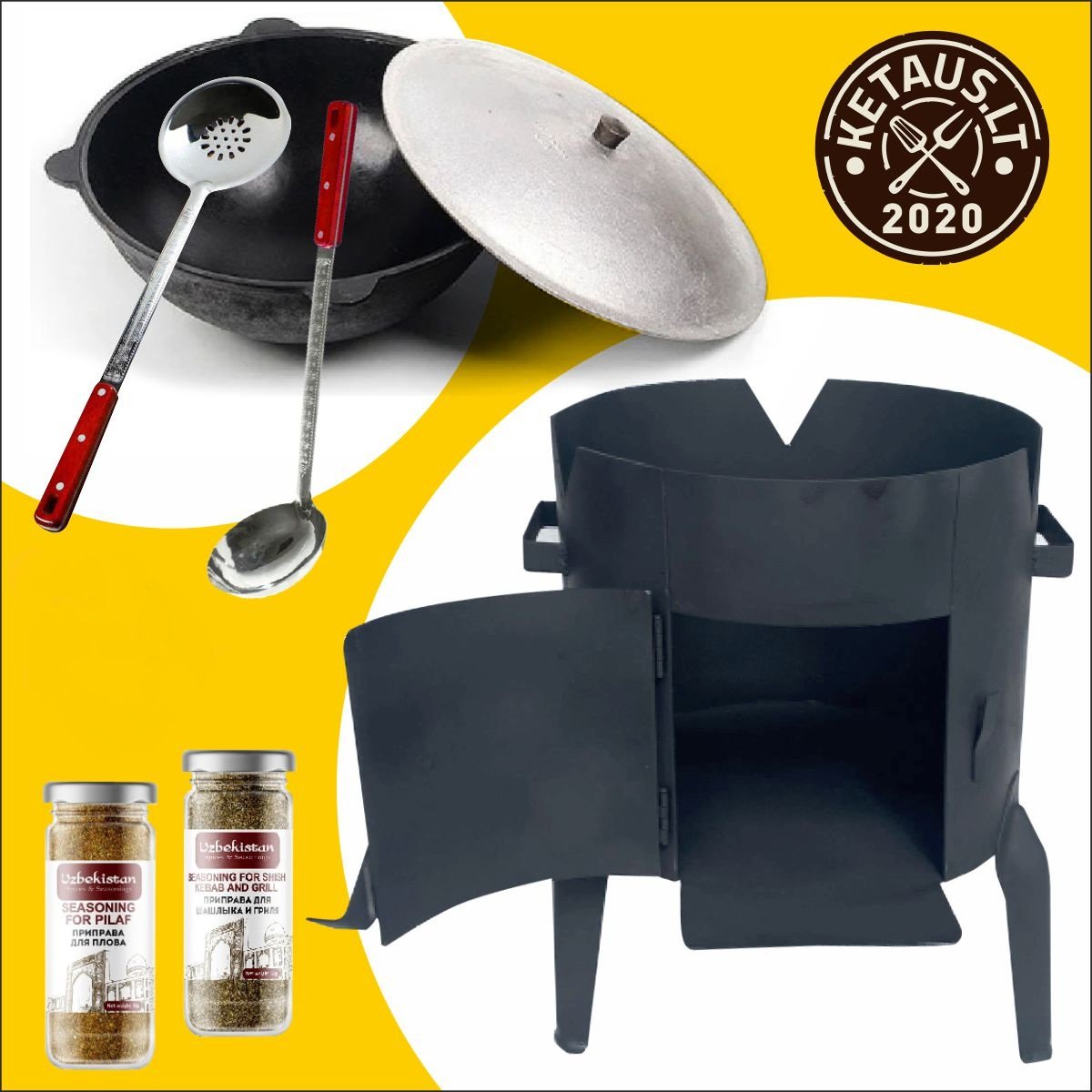 Komplekts: uzbeku Kazan 12L (Namangan), KRĀSNS KAZANAM 3mm, kausiņš, cedrs, uzbeku garšvielas plovam